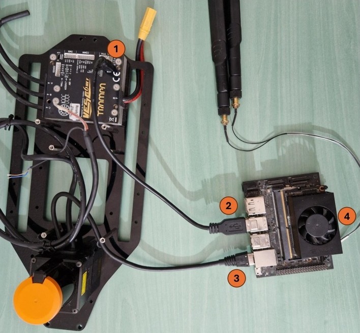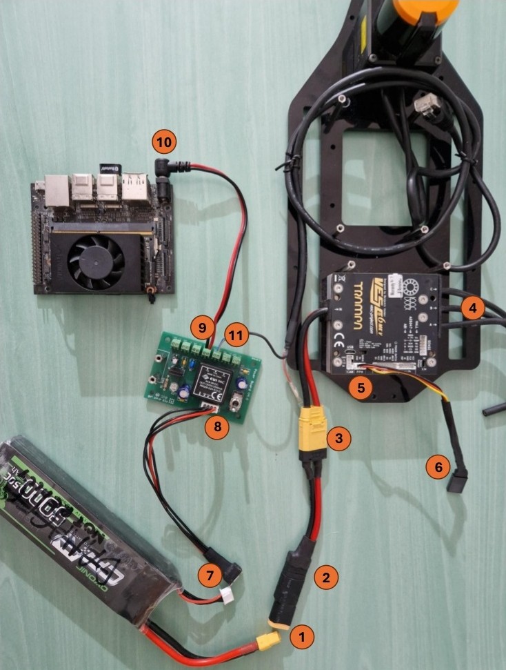 7) Connector of the battery for the power supply of the Jetson and the LiDAR. It goes to an adapter. The adapter is connected to the power supply board through 8
