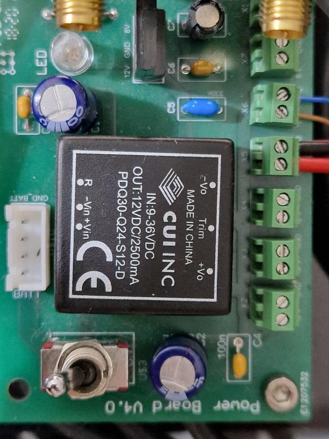 The power supply board can be seen, in frst approximation, as one DC/DC converter and one voltage regulator that are connected to the battery when the switch is turned on. If the switch is on, also the LED turns on.