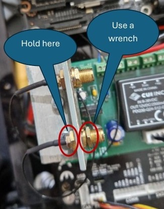 3) Dismount the antennas by rotating them. Pay attention to the “gold” connection and to the cable connected to them. Hold the nut at the side of the cable while you are dismounting the antenna to avoid twisting the cable.