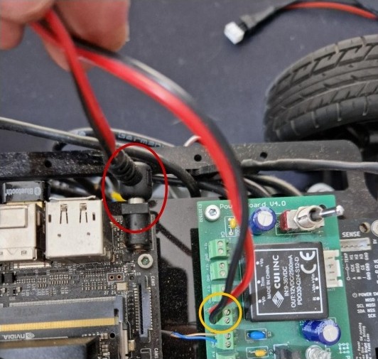 5) Detach the power cable of the Jetson. The Jetson has classical connector while to detach the cable from the power supply boars a screwdriver is needed (orange circle). When you attach back this cable, PAY ATTENTION TO THE POLARITY! So, you need to connect the red cable to 12V and the black cable to GND