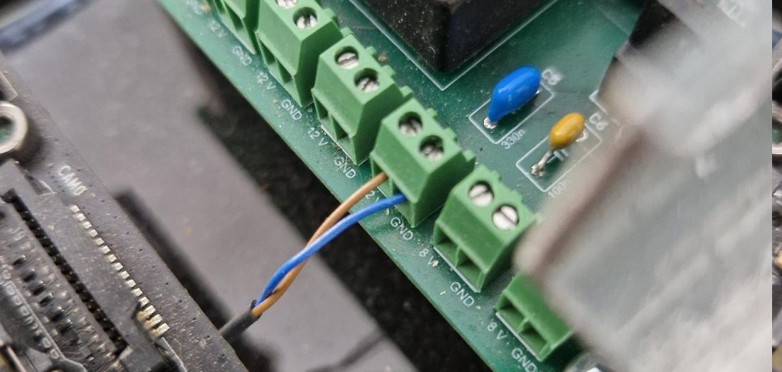 Take in the connection 7) the cable that goes to the power supply board and attach it to 13). Then, in connection 2) the right connector in the photo needs to be attached to 14). Finally, the left connector of the connection 2) needs to be connected to 12).