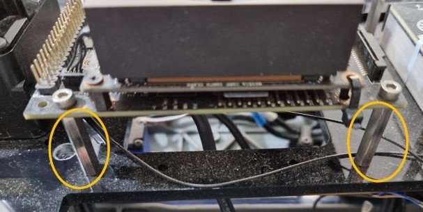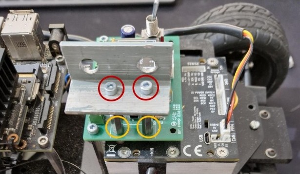 We can see also the screws for the spacer of the Jetson (Orange)and the screw for the spacers of the green power board (Blue). It is suggested to dismount them only if needed.