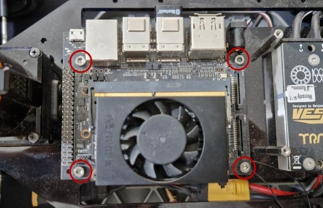 12) Dismount the Jetson. BE CAREFUL, YOU WILL HAVE AROUND 600 EUROS in your hand with a shipping time of 6 month, IF YOU BREAK IT, THEN YOU ARE DEAD. You need to unscrew these four screws.