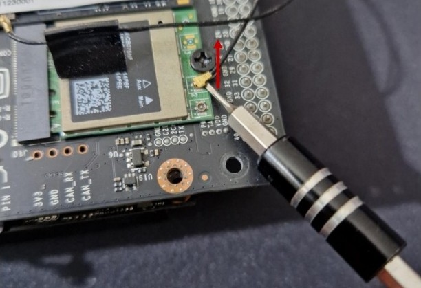 13) Now we need to detach the antenna from the Jetson. PAY ATTENTION. REALLY. ATTENTION PLEASE. Put the Jetson on fat plane in an upside-down position. Use a small fat screwdriver to detach the antenna connector. Put the tip under the cable and carefully arise the tip untill the cable is detached.