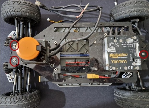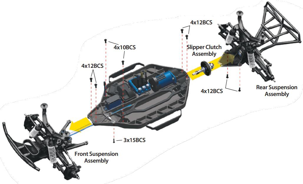 Turn the chassis over and remove the two 3x12mm countersunk crews that hold the bumper/skid plate to the bulkhead. The two front screws do not need to be removed.