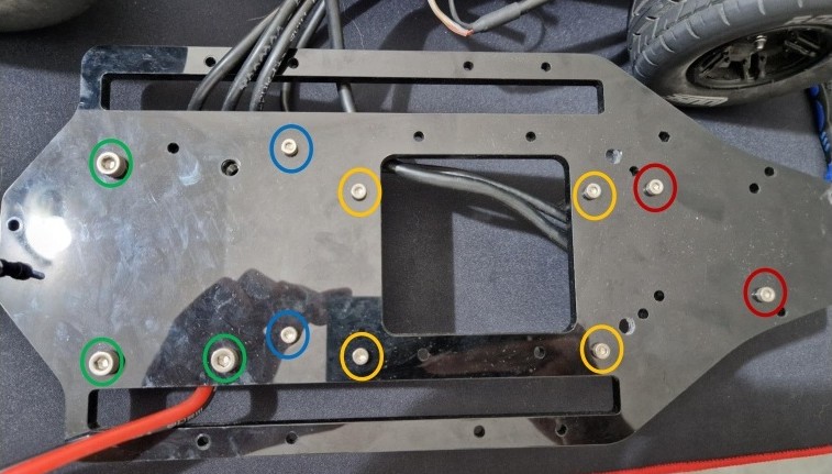 15) By put the plane upside down we can see the screw to dismount the LiDAR (Red) and the Vesc (Green) from the plane.