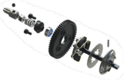 To recap, the motor has a pinion that is connected to the spur gear of the clutch (yes there is a clutch system). The clutch is connected to a transmission bar that gives power to both front and rear wheels. Both front and rear wheels are equipped with a diferential system.