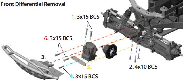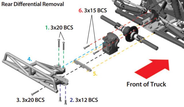 Remove two 3x15mm button-head screws from dif cover. Do not remove the two screws that secure the shock tower.